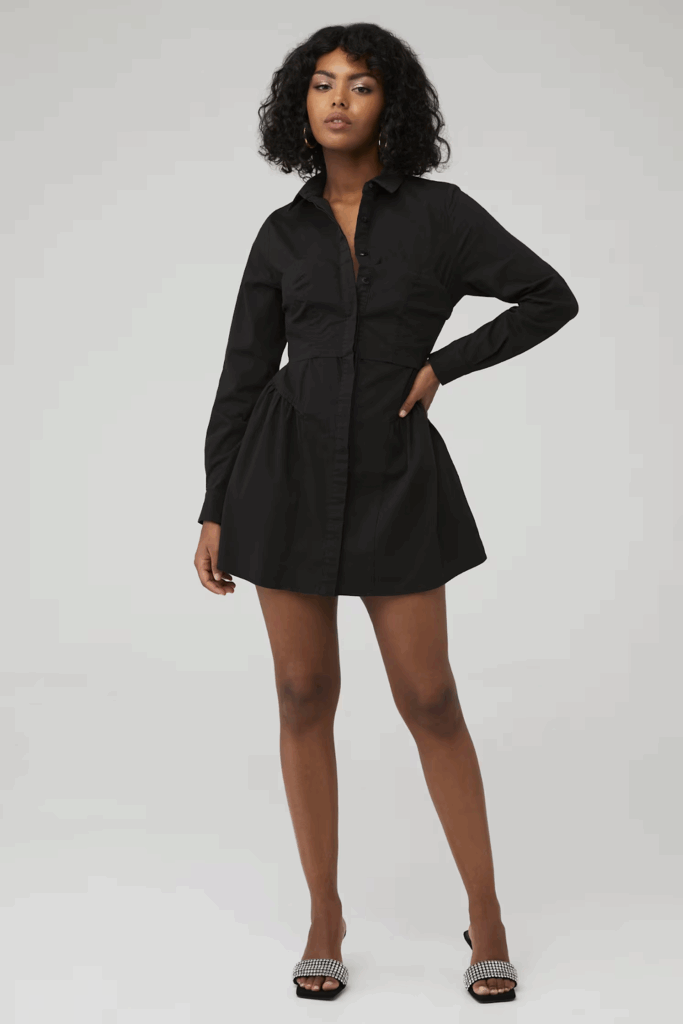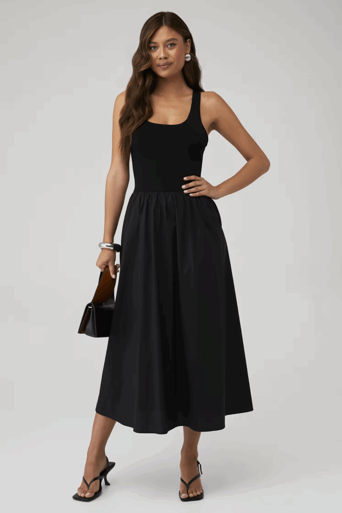 The dress’s noir shade provides a sophisticated edge, making it easy to accessorize with both bold and minimalist pieces.