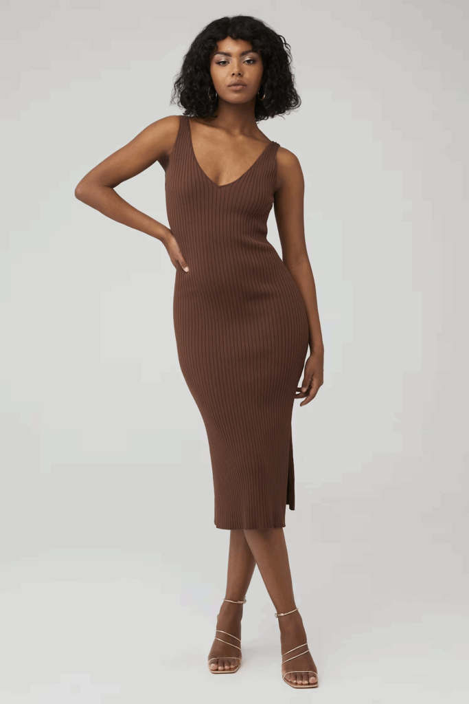 Stay cozy and chic with the Hall Sweater Dress by Line & Dot. This chocolate-colored dress is a must-have in any seasonal workwear fashion lineup.