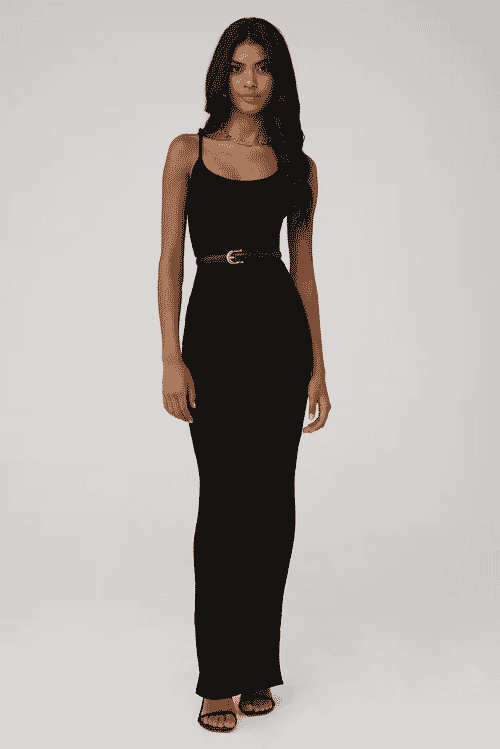 This black maxi dress offers a streamlined silhouette that flatters any figure, making it a prime choice among affordable dress rentals in March 2025.