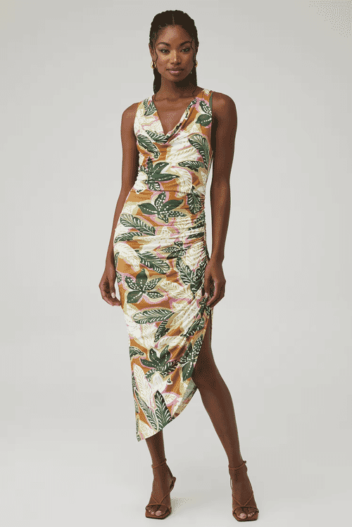 Last but not least, the X FashionPass Freda Midi Dress from Significant Other is a standout among Spring Weddings Dresses 2025. Its Palm Print design is stylish and unique, making it one of our Best Dresses for Spring Weddings. This dress is a statement piece that is sure to