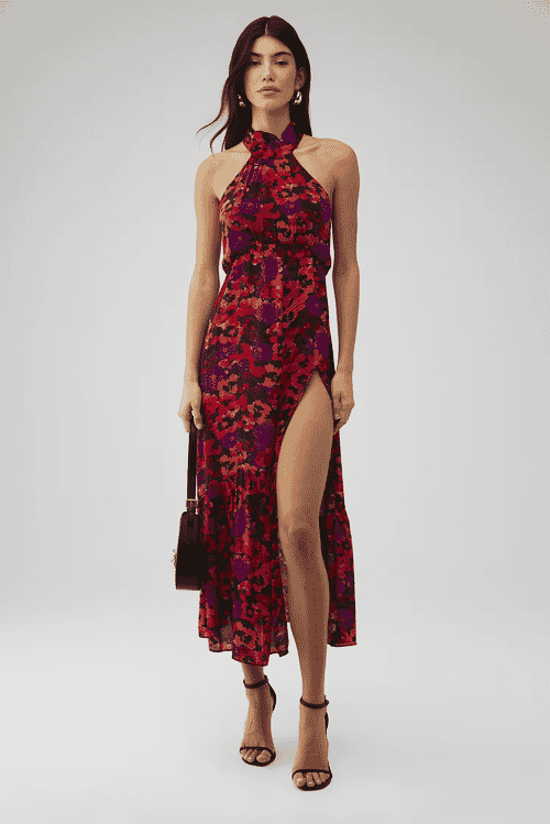 Next up is the Kailani Maxi Dress from Tiare Hawaii. The dress boasts a striking red floral print, ideal for those looking for a bold spring garden party fashion statement.