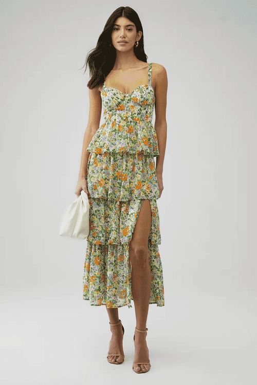 The Midsummer Dress from ASTR is a testament to the beauty of Spring. The dress features a Green Orange Floral design, making it one of our Best Dresses for Spring Weddings.