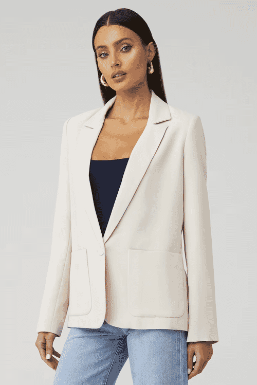 Finally, we have the Wallace Blazer from Amanda Uprichard. This bone-colored blazer offers a perfect blend of elegance and functionality. It’s a versatile piece that can be paired with almost anything in your wardrobe.