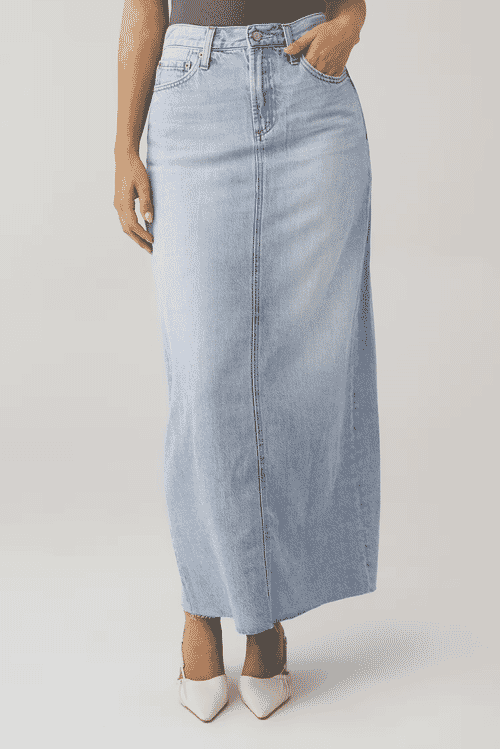Lastly, we have the Raye Skirt by PISTOLA. This jardin shade denim skirt is a unique and stylish option for winter. Pair it with thick tights and knee-high boots for a chic winter outfit.