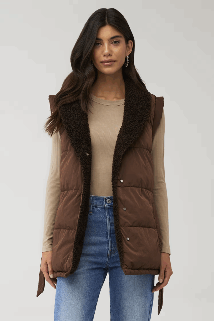 For those seeking versatility, the Lanville Reversible Gilet by Varley is a perfect choice. Available in chestnut and coffee bean hues, this gilet offers two looks in one.