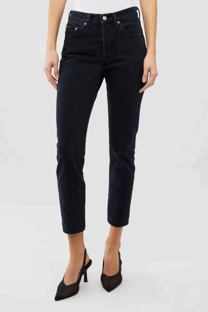 Levis’ 501 Skinny jeans in Black Licorice are a fall wardrobe essential. Their sleek black color allows for easy pairing with any top, while the skinny fit provides a modern silhouette.