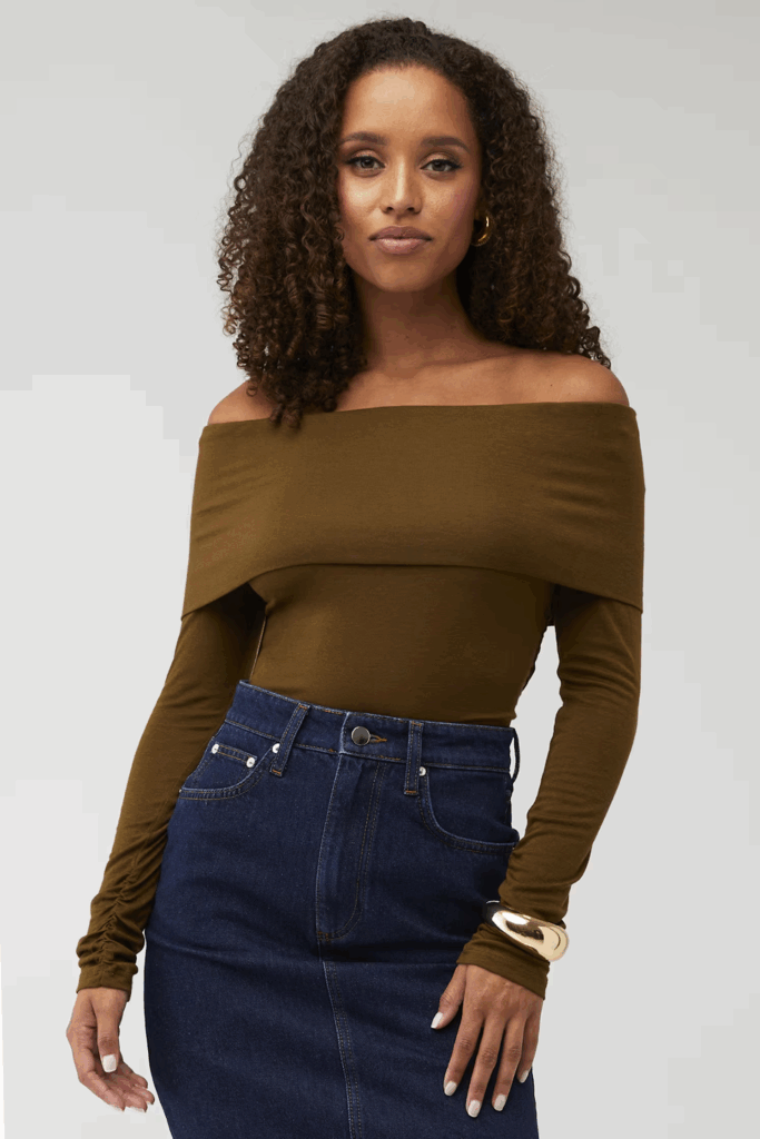 Add a touch of flair to your fall wardrobe with Crescent’s Off The Shoulder Top in Olive. This trendy piece is a must-have for those looking to rent neutral clothing for fall.