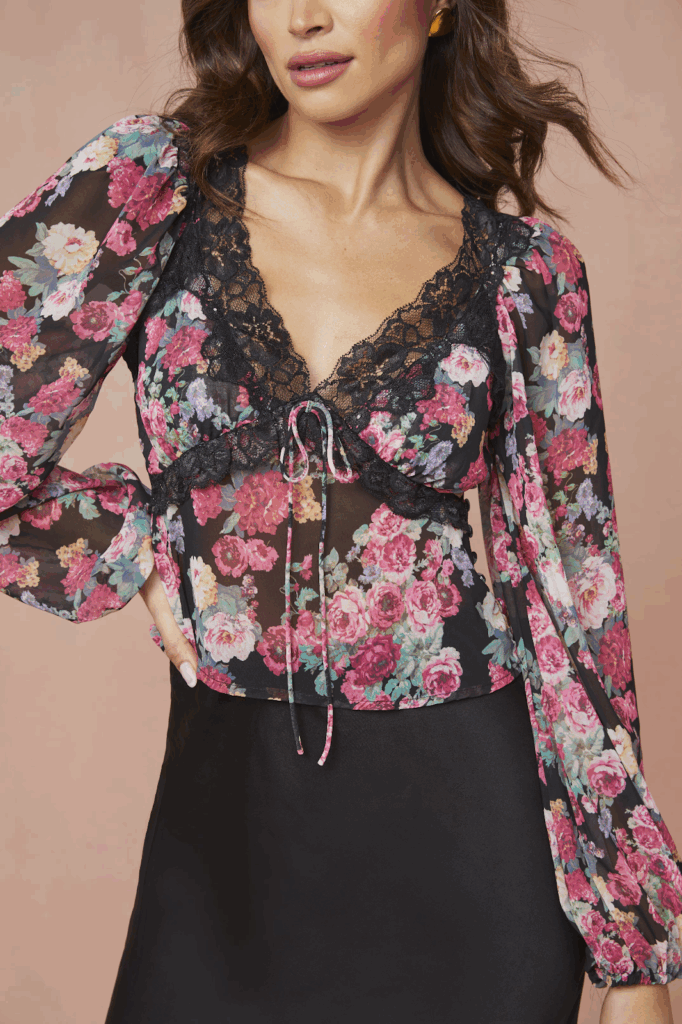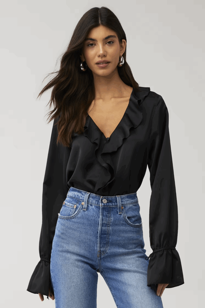 For a classic yet modern look, opt for the Adela Ruffle Top by Show Me Your Mumu in black luxe satin.