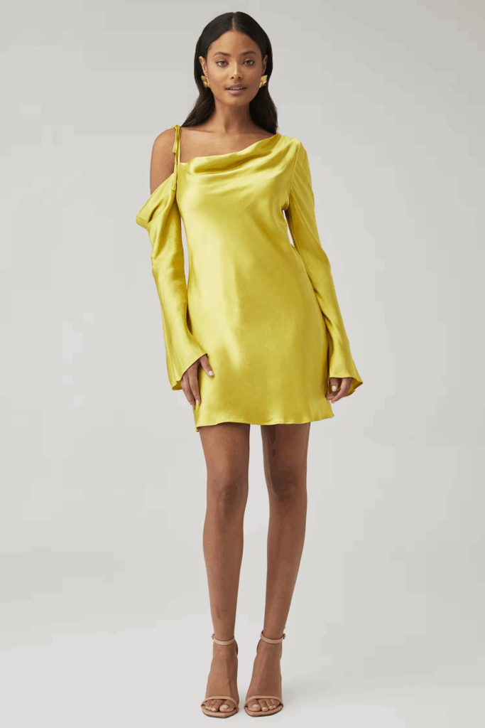 Make a bold entrance with the Sofia Asymmetrical Mini Dress by Shona Joy. This lime-colored dress features a unique asymmetrical design that adds a modern twist to traditional party dresses.