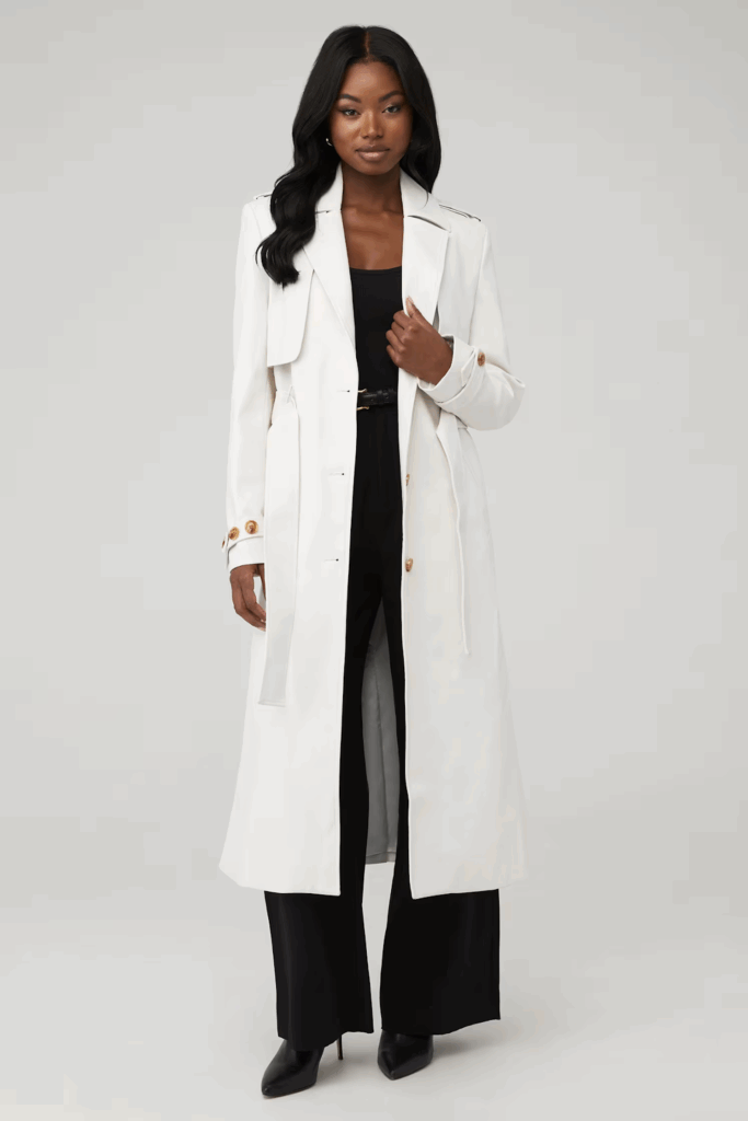 The Bardot Vegan Leather Trench Coat in ivory is a chic and sophisticated option for Christmas travel. This coat’s vegan leather material provides a sleek and polished look that’s perfect for any occasion.