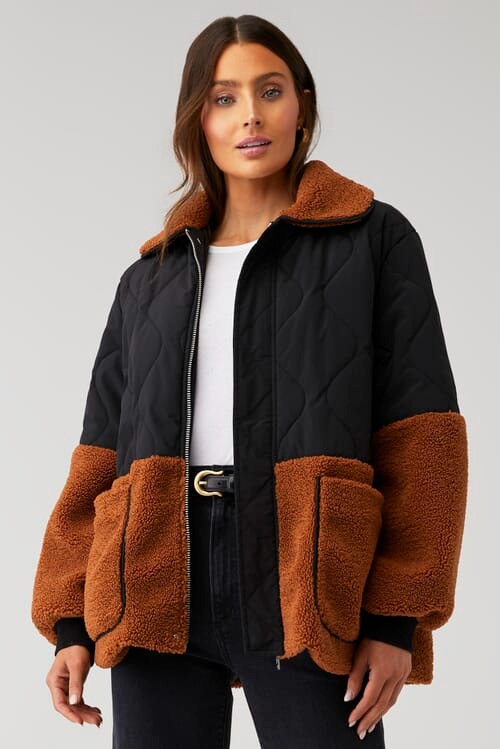 Stay warm and cozy with the Toasty Vibes Jacket from Blank NYC. Featuring a trendy black/rust sherpa design, this jacket is perfect for those brisk late-fall days.