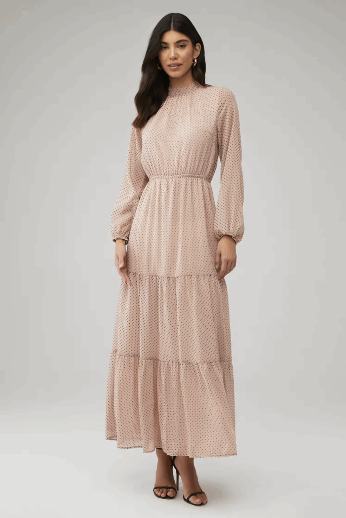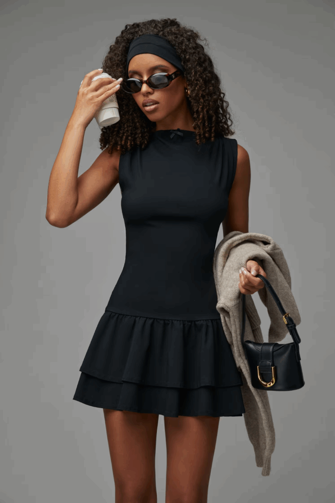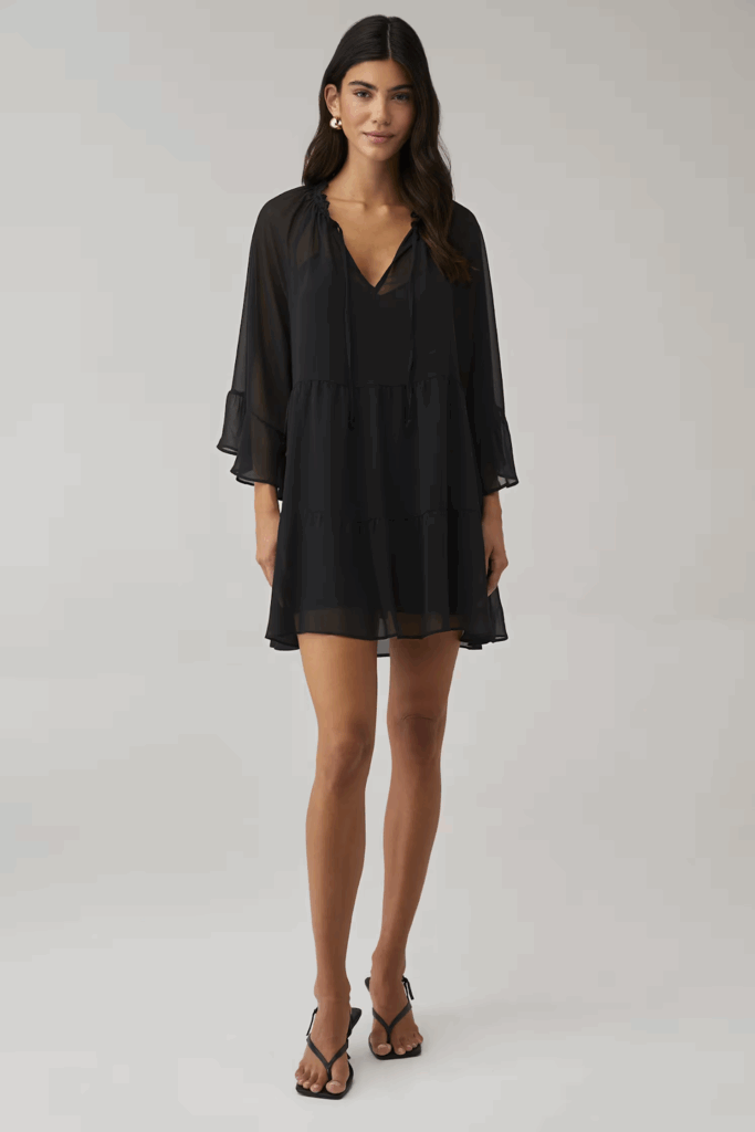 This black mini dress offers a playful silhouette with long sleeves, making it perfect for transitioning from day to night. Its chic design and comfortable fit make it an ideal option for an evening out, whether you’re hitting the town or attending a more casual gathering.
