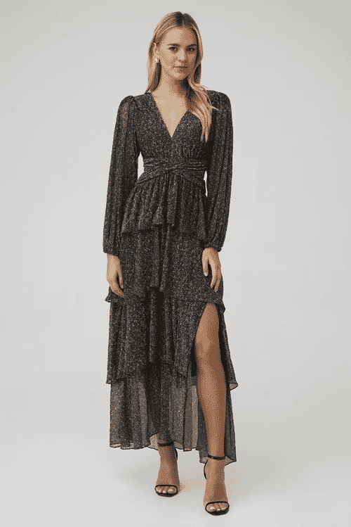 Let’s start our list of winter wedding guest dresses with the chic Anora Dress from ASTR. This black multi dress features a beautiful floral pattern, providing an elegant contrast that’s perfect for a winter wedding.