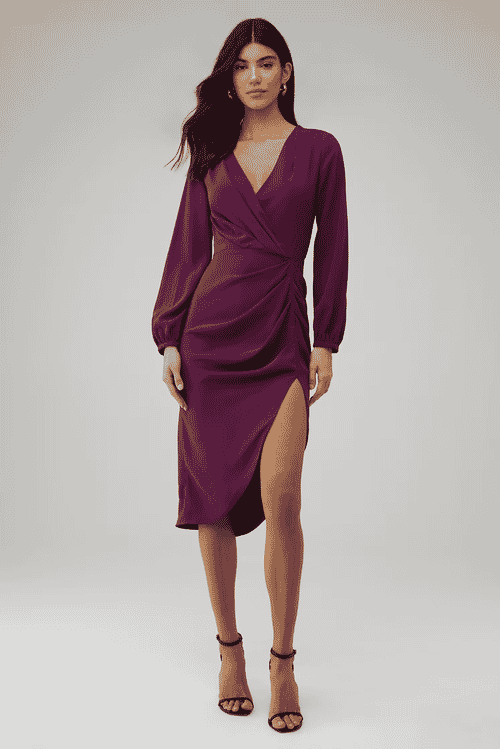 The Margie Dress from SER.O.YA is a standout among winter wedding guest dresses. Its deep eggplant color is perfect for a winter color palette. The long sleeves and maxi length provide coverage from the cold, while the slight slit adds a touch of allure.