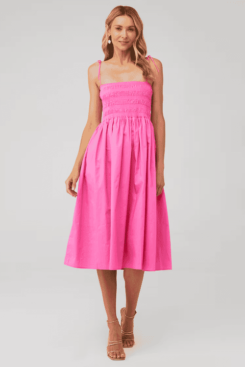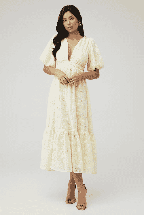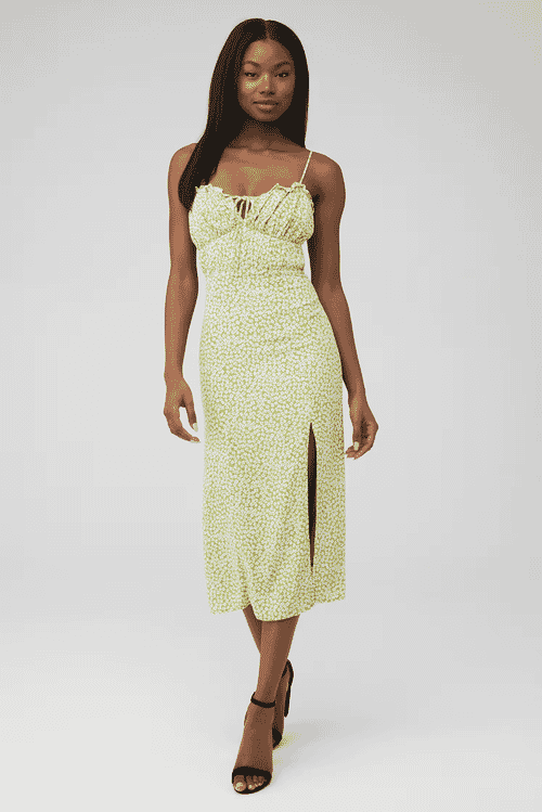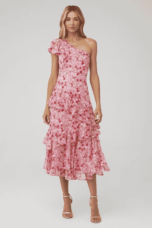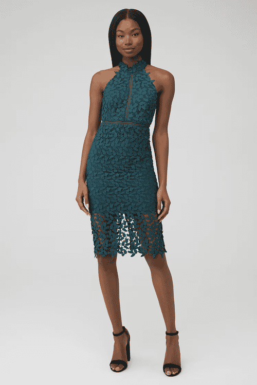 Let’s start our list of winter wedding guest dresses with the chic Anora Dress from ASTR. This black multi dress features a beautiful floral pattern, providing an elegant contrast that’s perfect for a winter wedding.
