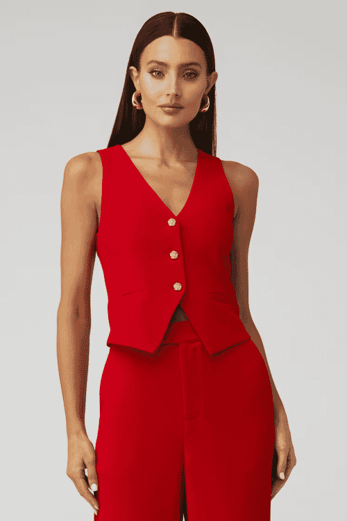 Add a touch of sophistication with the Pythia Vest by Karina Grimaldi. This versatile vest is perfect for layering and adds a chic element to any outfit.