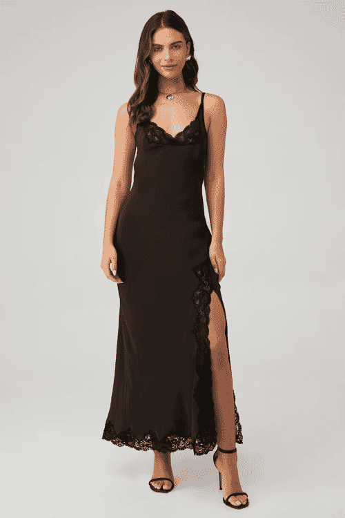 Complete your date night look with the Deja Vous Slip Dress by Bec + Bridge. Its elegant design and flowing silhouette make it a perfect choice for any romantic occasion.
