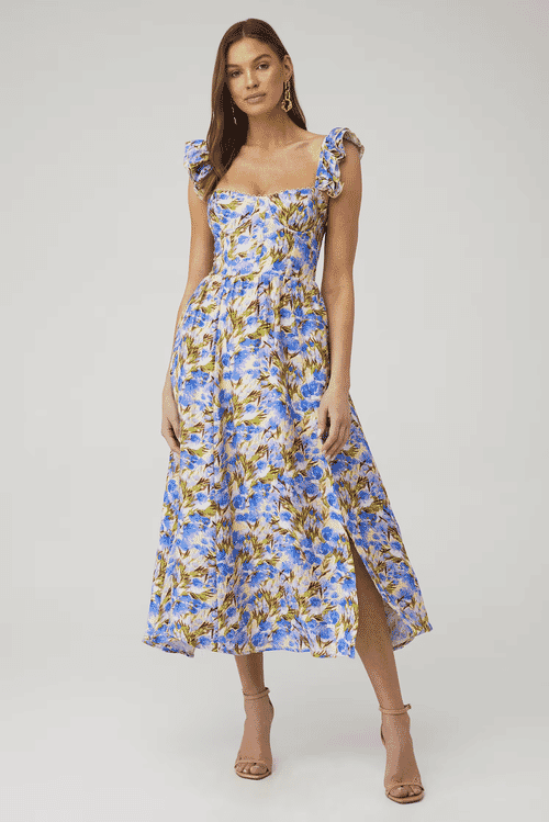 Step into romance with the Guinevere Maxi Dress by For Love & Lemons. This dress features a flattering silhouette and is perfect for a romantic evening.