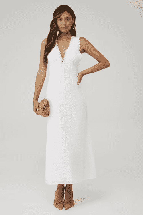 Start your engagement photo journey with the Blanche Halter Maxi Dress by BEC + BRIDGE. This elegant maxi dress features a halter neckline and flowing silhouette, perfect for capturing romantic moments in outdoor settings like gardens or meadows. Wear it to your engagement party for a touch of sophistication and grace.