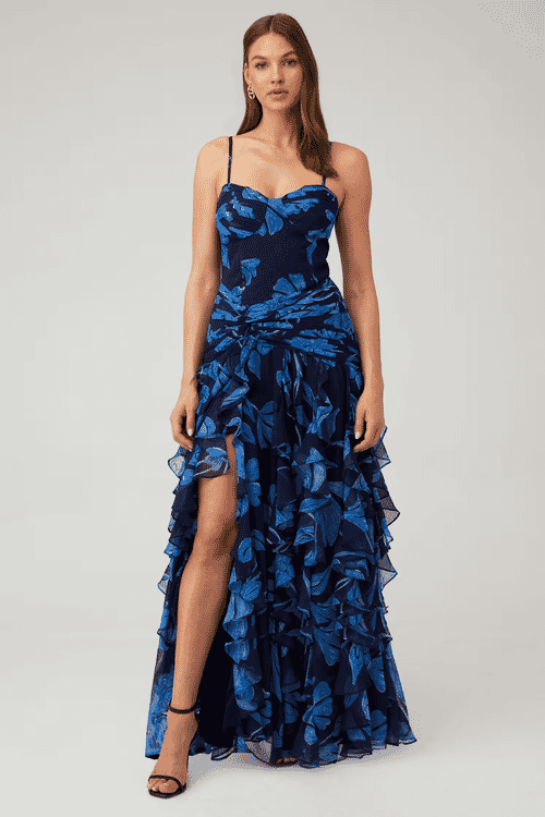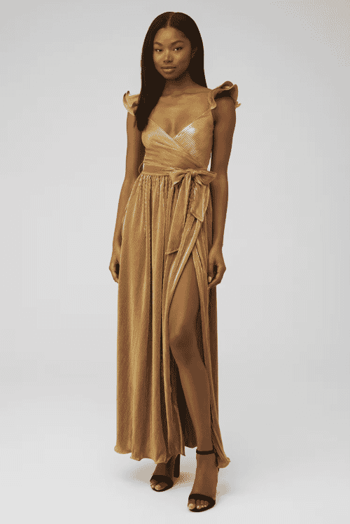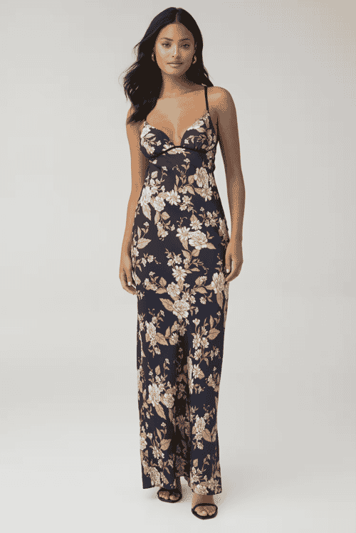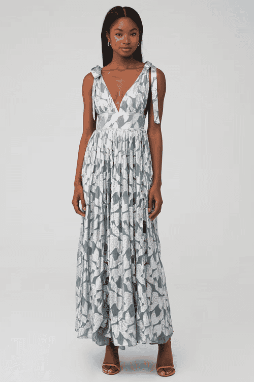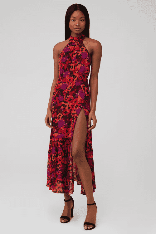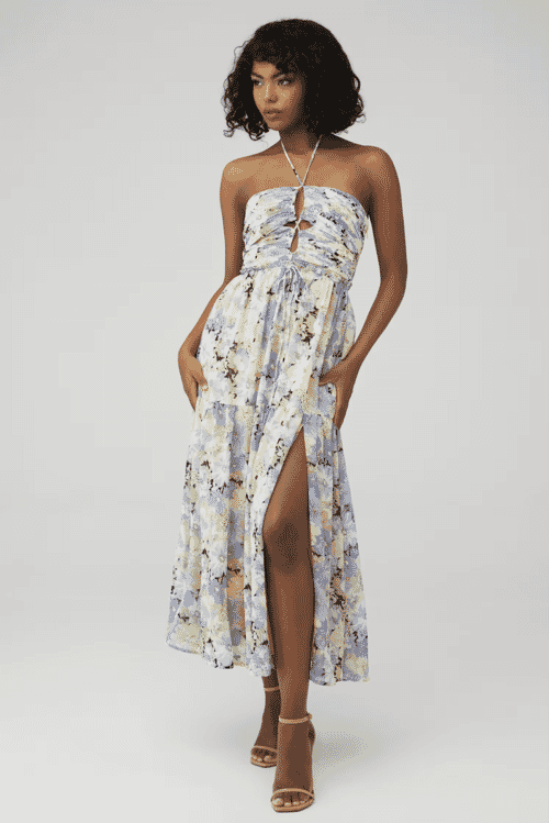 Start your engagement photo journey with the Blanche Halter Maxi Dress by BEC + BRIDGE. This elegant maxi dress features a halter neckline and flowing silhouette, perfect for capturing romantic moments in outdoor settings like gardens or meadows. Wear it to your engagement party for a touch of sophistication and grace.