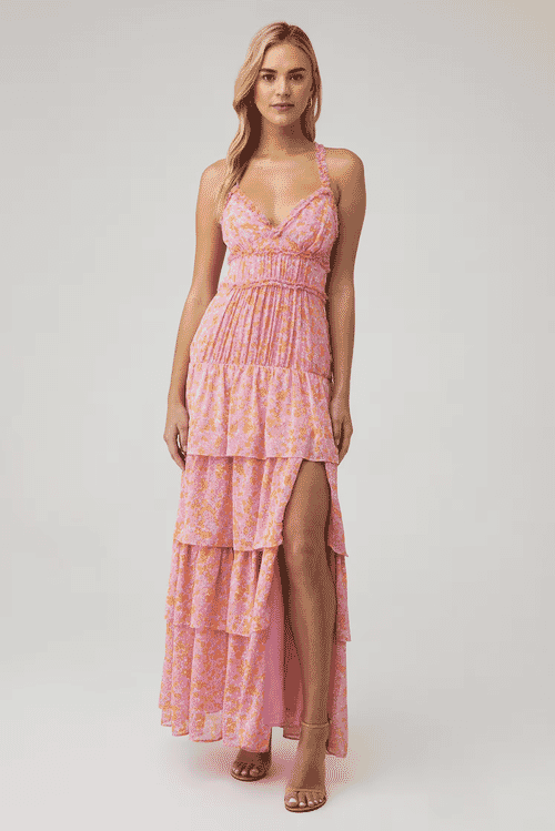 You’re sure to make a statement with the Athena Maxi dress from Likely. This Spring 2025 home rental is a blend of powder pink and other complementary colors, making it perfect for a day out in the sun.